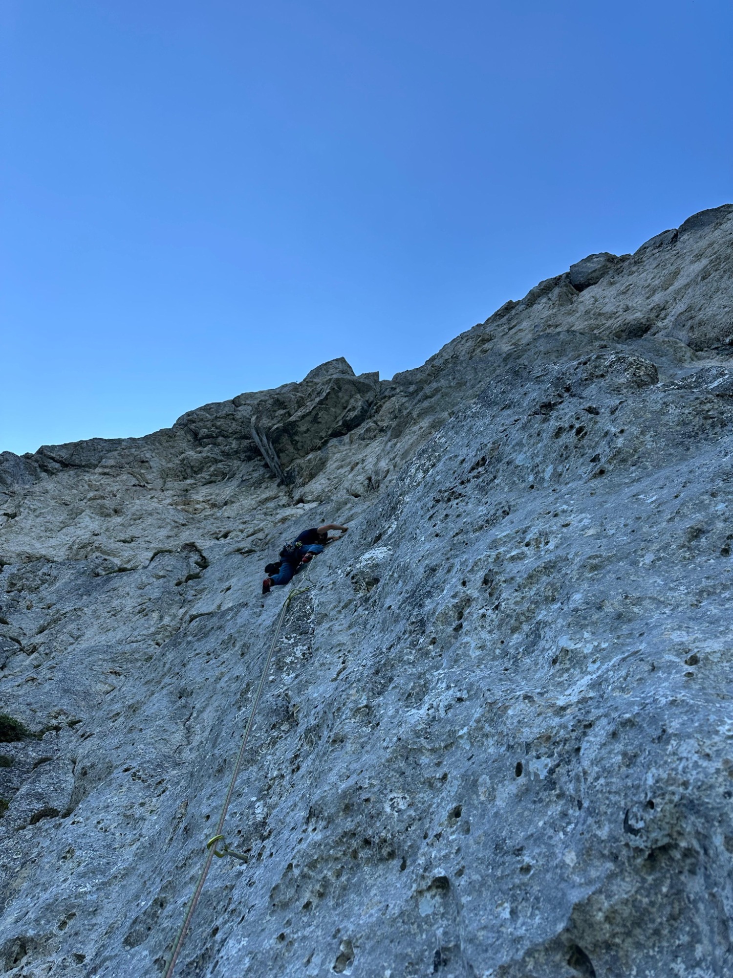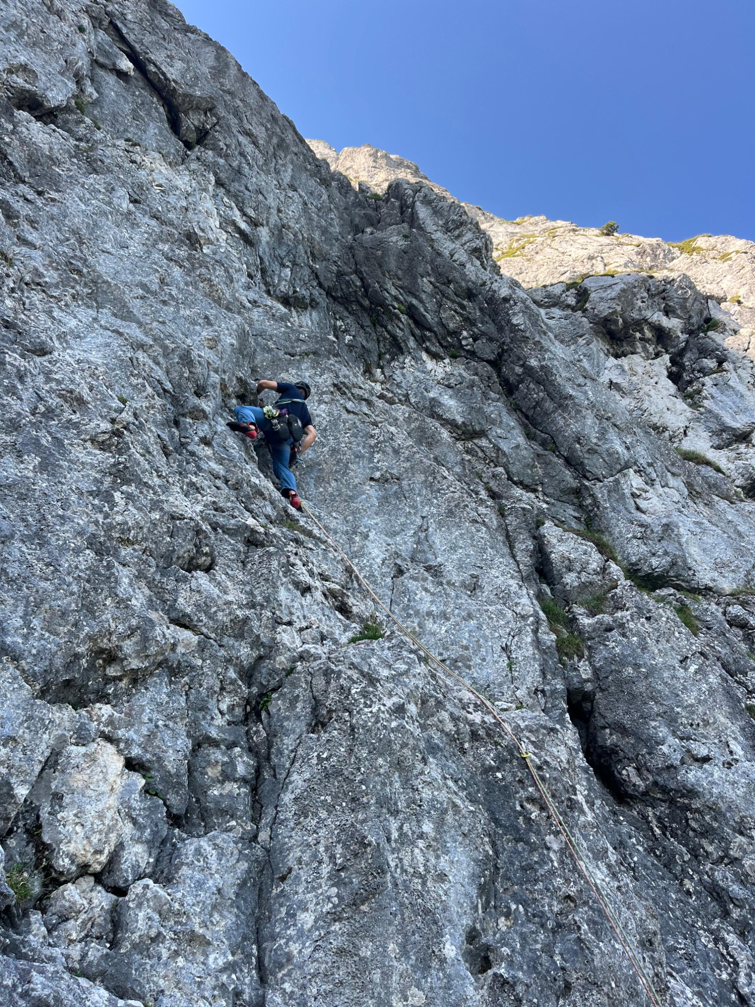 In abwechslungsreicher Kletterei – aber immer stiel – geht es anhaltend im siebten Schwierigkeitsgrat durch die Nordwand. Zum Abschluss wartet die schwerste Seillänge – ein Offwith im achten Grat. Diese Seillänge kann allerdings deutlich leichter umgangen werden über die Via Bavaria. Ausgestiegen wird direkt am Gipfelkreuz.