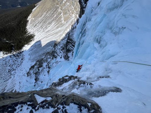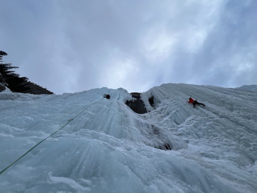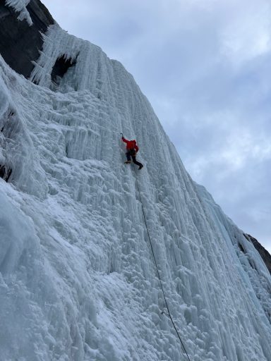 Heute geht es an den imposanten Hauptfall (ca. 60 m). Im abwechslungsreichen Eis trainieren wir das Setzen von Eisschrauben, den Bau solider Standplätze und das sichere Nachsteigen. Theorie und Praxis verbinden sich Schritt für Schritt zu einem sicheren Gesamtbild.