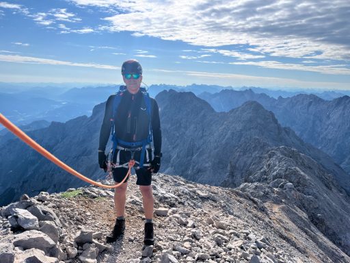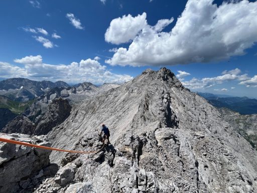 Wir treffen uns in der Früh in Garmisch und fahren gemeinsam mit der ersten Bahn zum Gipfel der Zugspitze. Von dort folgt man dem schmalen Gratverlauf in ständigem Auf und Ab – stets in ausgesetztem, hochalpinem Gelände. Unterwegs überschreitet man mehrere markante Gipfel: die Innere Höllentalspitze (2.741 m), die Mittlere Höllentalspitze (2.742 m) und die Äußere Höllentalspitze (2.721 m). Es folgt die Überschreitung der Vollkarspitze (2.630 m), bevor man unterhalb des markanten Hochblassen entlangquert. Schließlich erreicht man den formschönen Gipfel der Alpspitze (2.628 m).