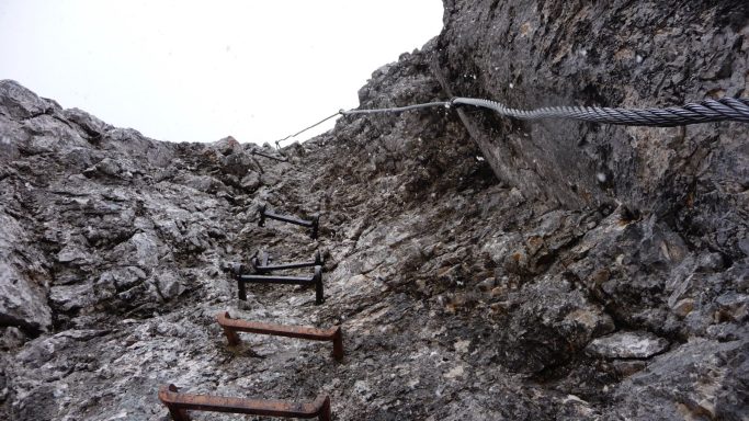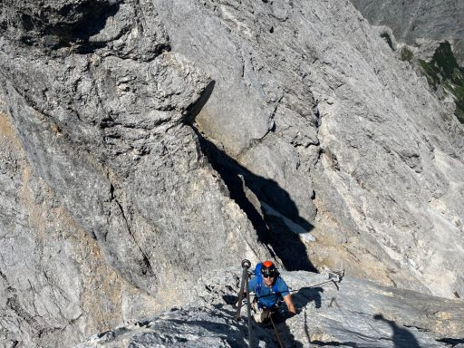 Besonders eindrucksvoll: die endlosen Tiefblicke ins Höllental, die Ausblicke bis in die Dolomiten und der ständige Wechsel zwischen ausgesetztem Gehgelände und leichter Kletterei.