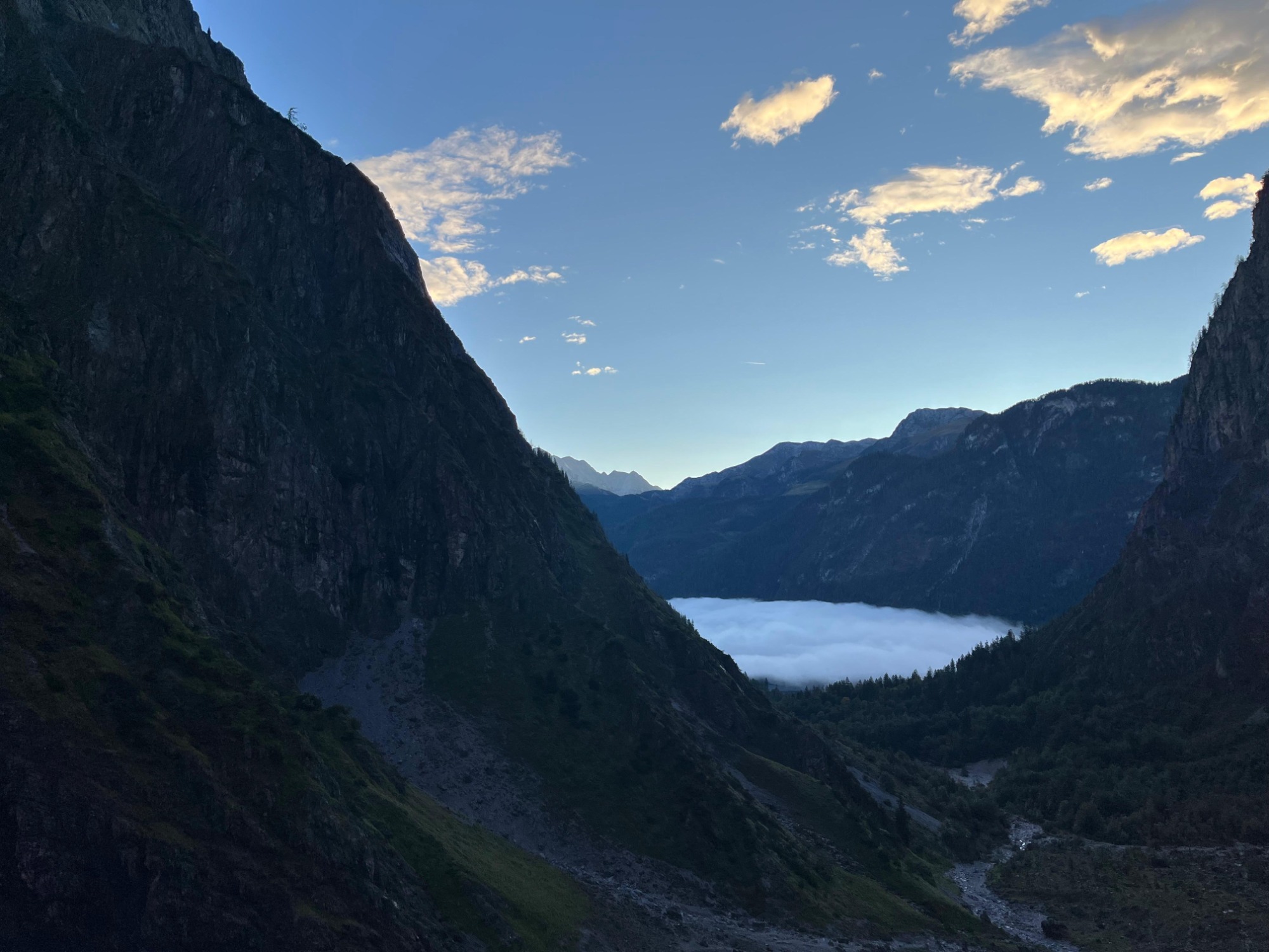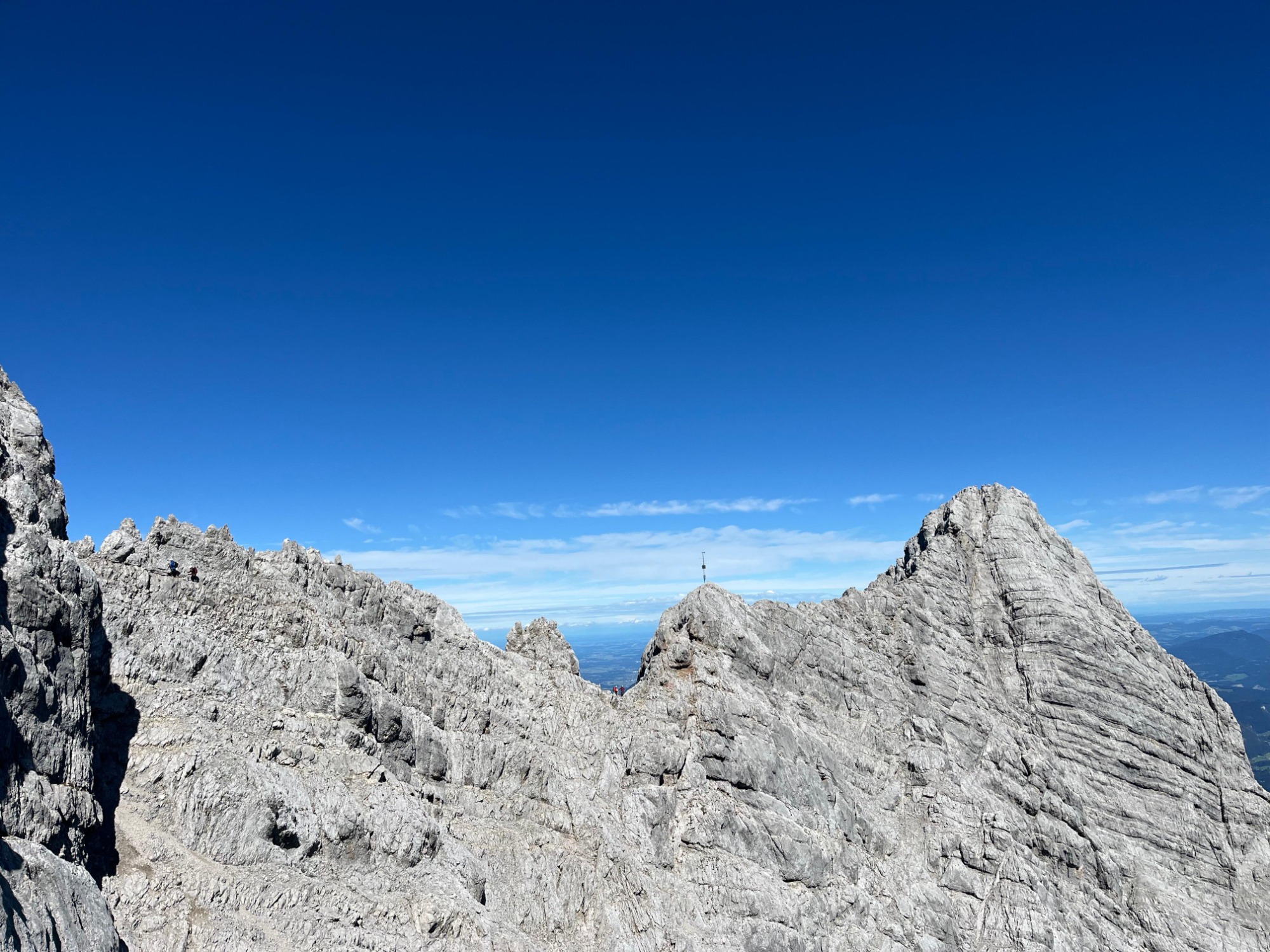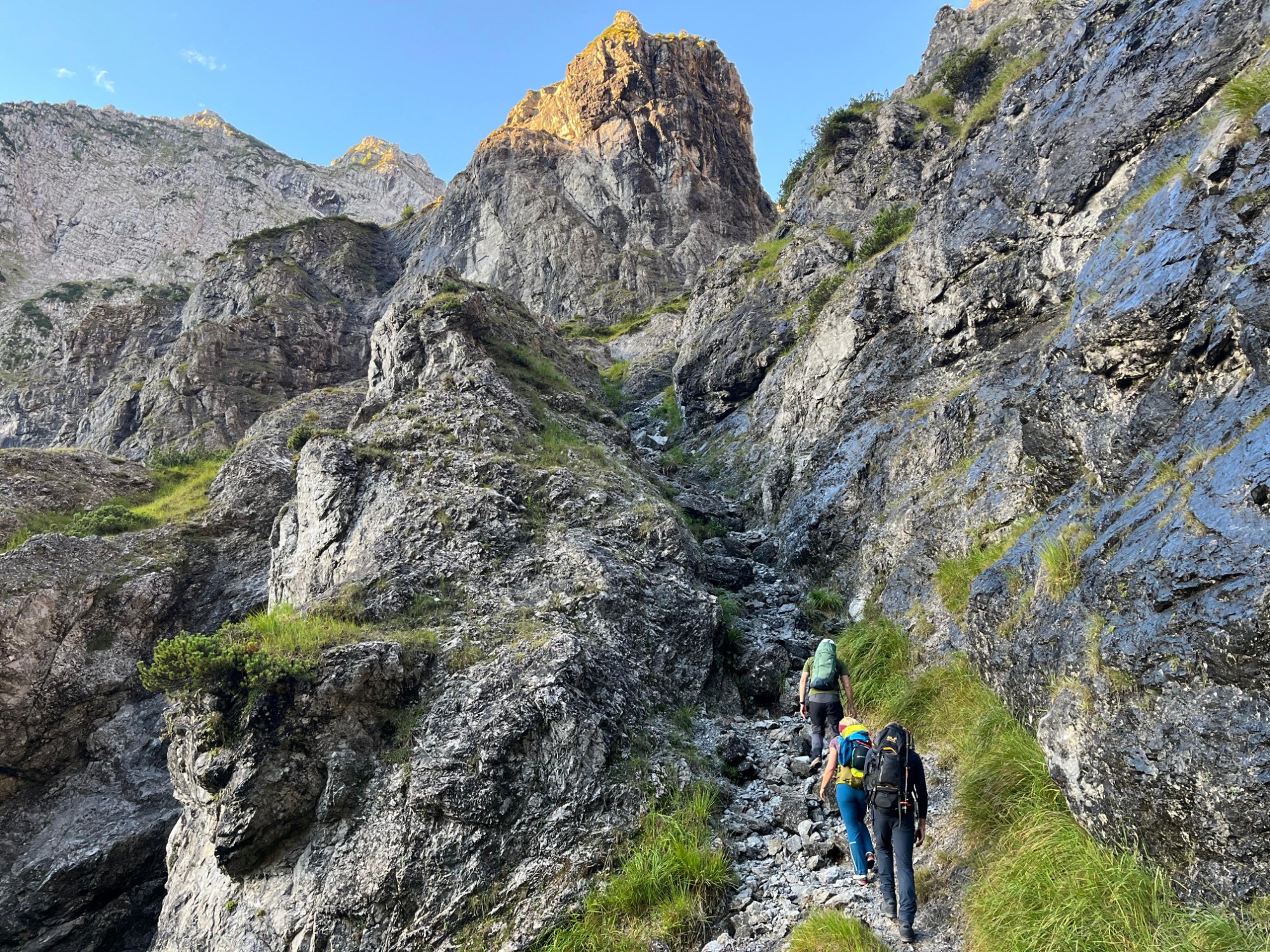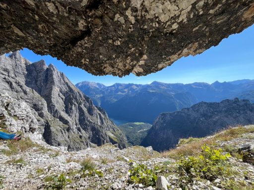 Früh am Morgen geht es über einen Wanderweg bis zum Fuß der Ostwand – perfekt zum Aufwachen. Vorbei an den Resten der eingestürzten Eiskapelle beginnt die Ostwand-Kletterei. Durch steile Wandfluchten schlängelt sich der Berchtesgadener Weg. Die Kletterei ist stets anspruchsvoll aber nicht extrem. Die Hauptschwierigkeit stellt die Wegfindung durch das Ostwand-Labyrinth dar – mit einem Bergführer an deiner Seite kannst du die jedoch ganz auf die Kletterei und die atemberaubende Umgebung konzentrieren.